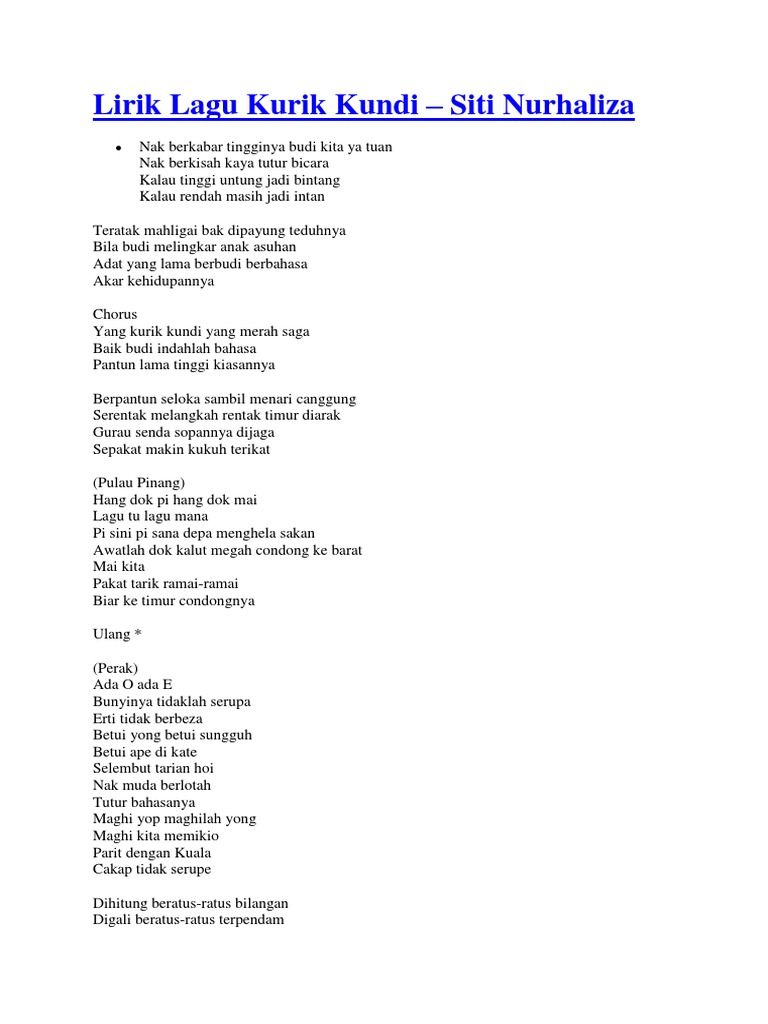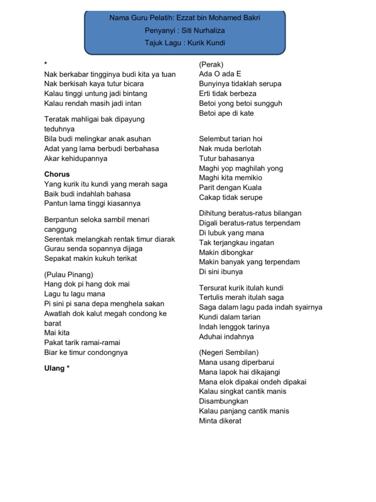 Lirik Lengkap Nyanyian Solo Lagu Irama Malaysia D4pqrog3wrnp from idoc.pub Ketikkan nama penyanyi dan judul lagu, berikan tanda kutip di judul lagu, misal: Sanggar mustika release date : Dato' sri siti nurhaliza album : Kurik kundi siti nurhaliza lirik mp3 & mp4. Download lagu kurik kundi mp3. Download lagu kurik kundi mp3 secara gratis di kurik kundi. Kurik kundi (minus one + lirik) mp3 duration 5:57 size 13.62 mb / itsaiman official 7. Tutur bicara kalau tinggi untung jadi bintang oh oh oh kalau rendah masih jadi intan teratak mahligai bak dipayung teduhnya bila budi melingkar anak asuhan adat yang lama berbudi berbahasa akar.